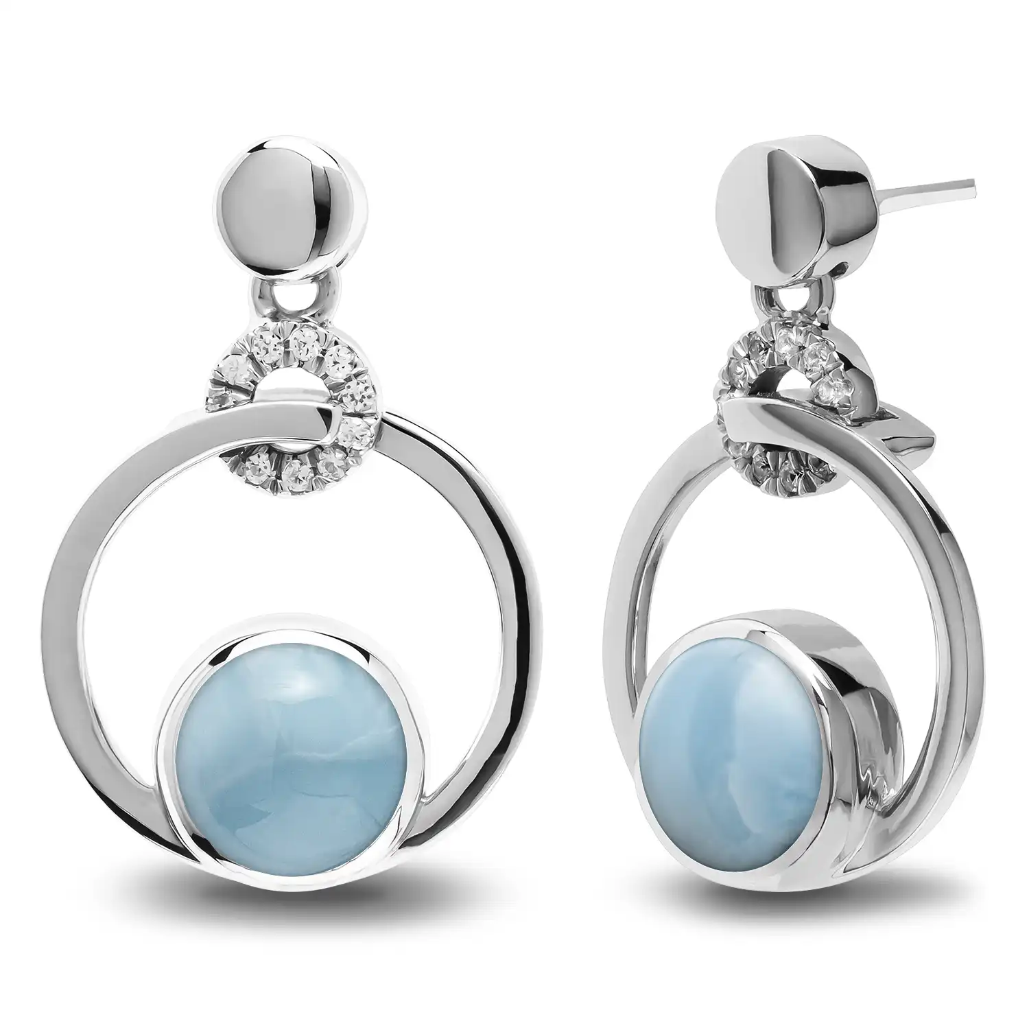 Each pair of Marahlago Larimar earrings features precision-engineered settings that protect the gemstones while maximizing their