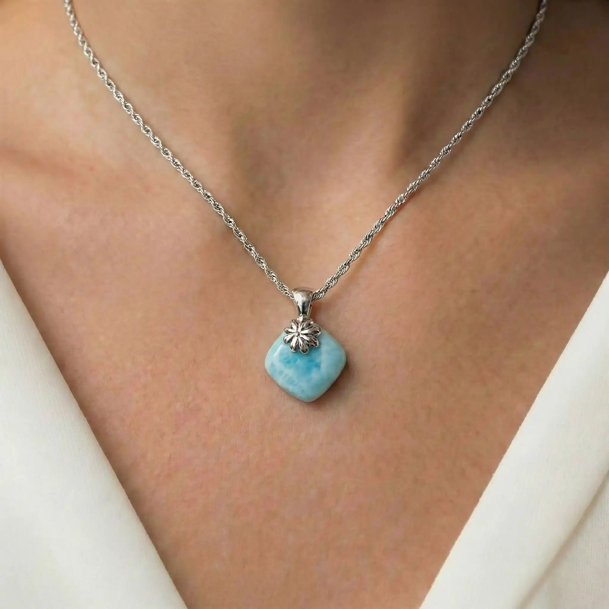The ABRIL LARIMAR NECKLACE comes with a sterling silver chain that effortlessly adjusts to create the perfect look for every occasion.