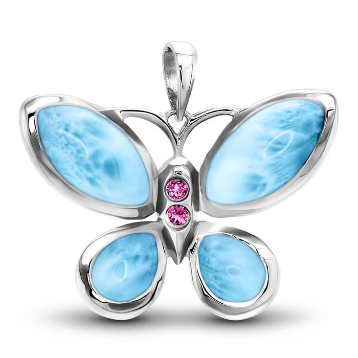 This pendant is a feat of artistry: the wings are crafted from four individual pieces of Larimar, expertly cut to mimic the pattern of real butterfly wings. The body glistens with pink sapphires, adding a trail of light to every movement.