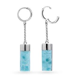 The Castaway earrings are an embodiment of a modern and striking design. Simply elegant cylinders of luminous Larimar, capped with sterling silver, are suspended from graceful rings with exquisite beauty.