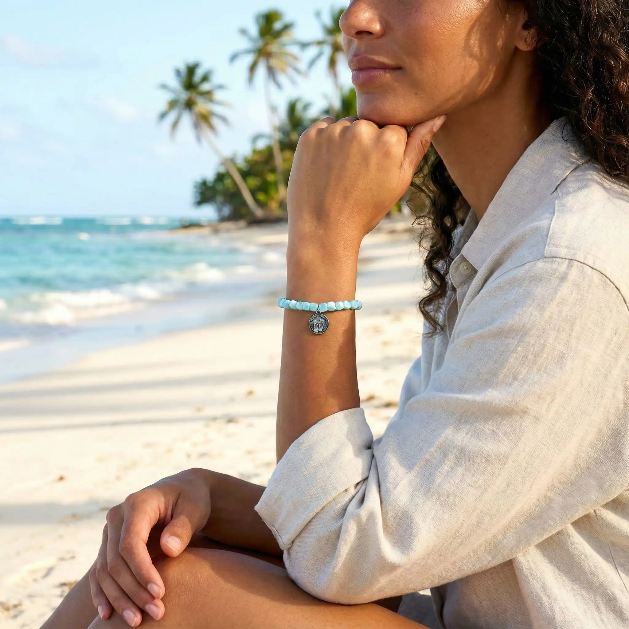 It's the perfect blend of casual charm and seaside elegance. The bracelet features a single, smooth, calming Larimar bead—that iconic blue stone that looks exactly like a piece of the serene Caribbean Sea. Hanging right next to it is a sweet little Flip Flop charm with an antique-tone finish, adding a touch of laid-back whimsy.