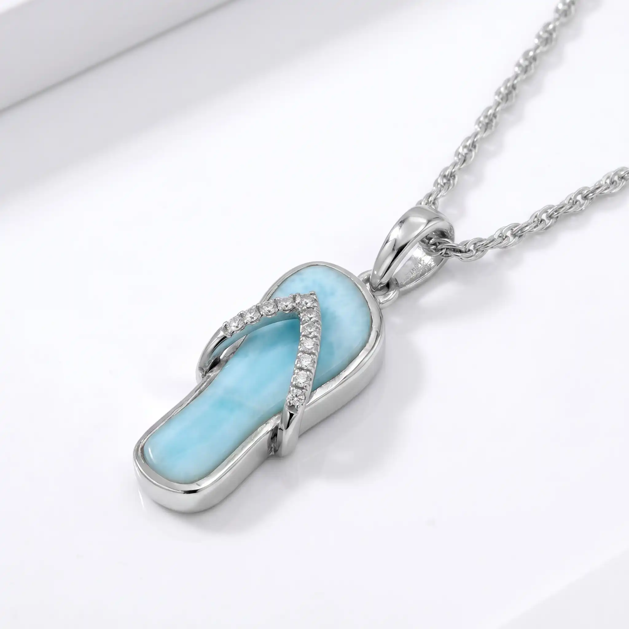 This isn't your average beach souvenir. We’ve elevated the classic sandal silhouette by paving the strap with dazzling White Sapphires, adding a diamond-like shimmer that catches the sunlight. The sole of the sandal is inlaid with our signature Larimar, creating the illusion that you are carrying a piece of the Caribbean sea wherever you go.