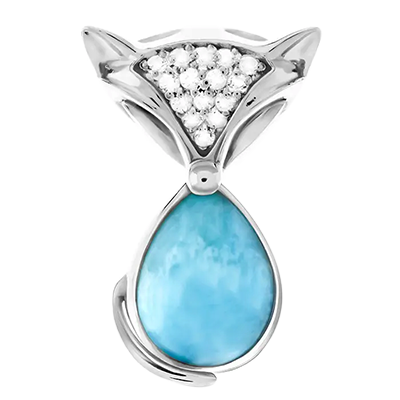 This pendant features a graceful Sterling Silver fox motif, capturing the creature's clever spirit. The body of the fox is set with a striking piece of Larimar gemstone (5/16" x 7/16"), giving the pendant a calming, serene blue core, accented by shimmering White Sapphires. And here's why you can trust this piece: the Larimar is securely bezel-set in the silver, meaning thereโs virtually no chance of the stone falling out or being lost.