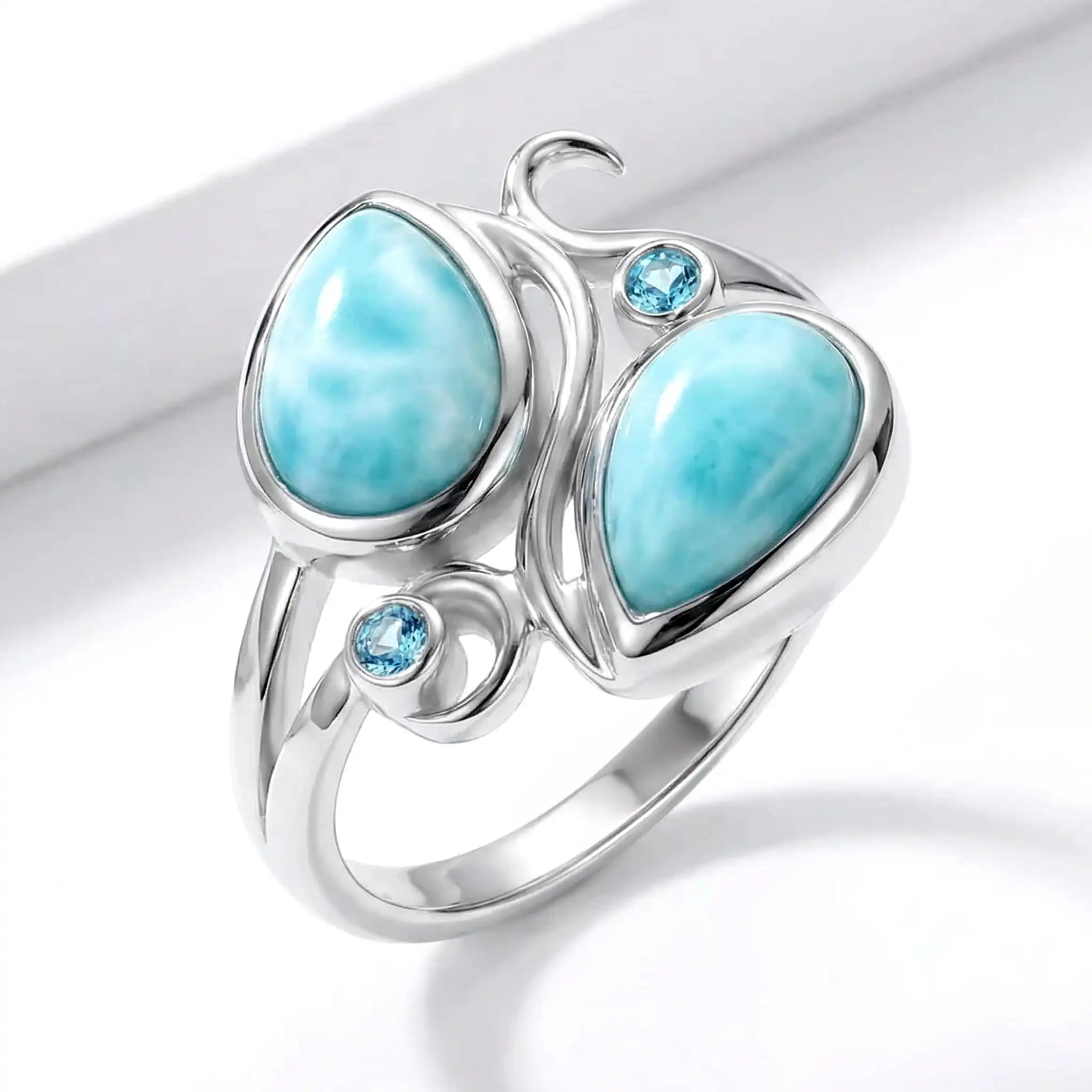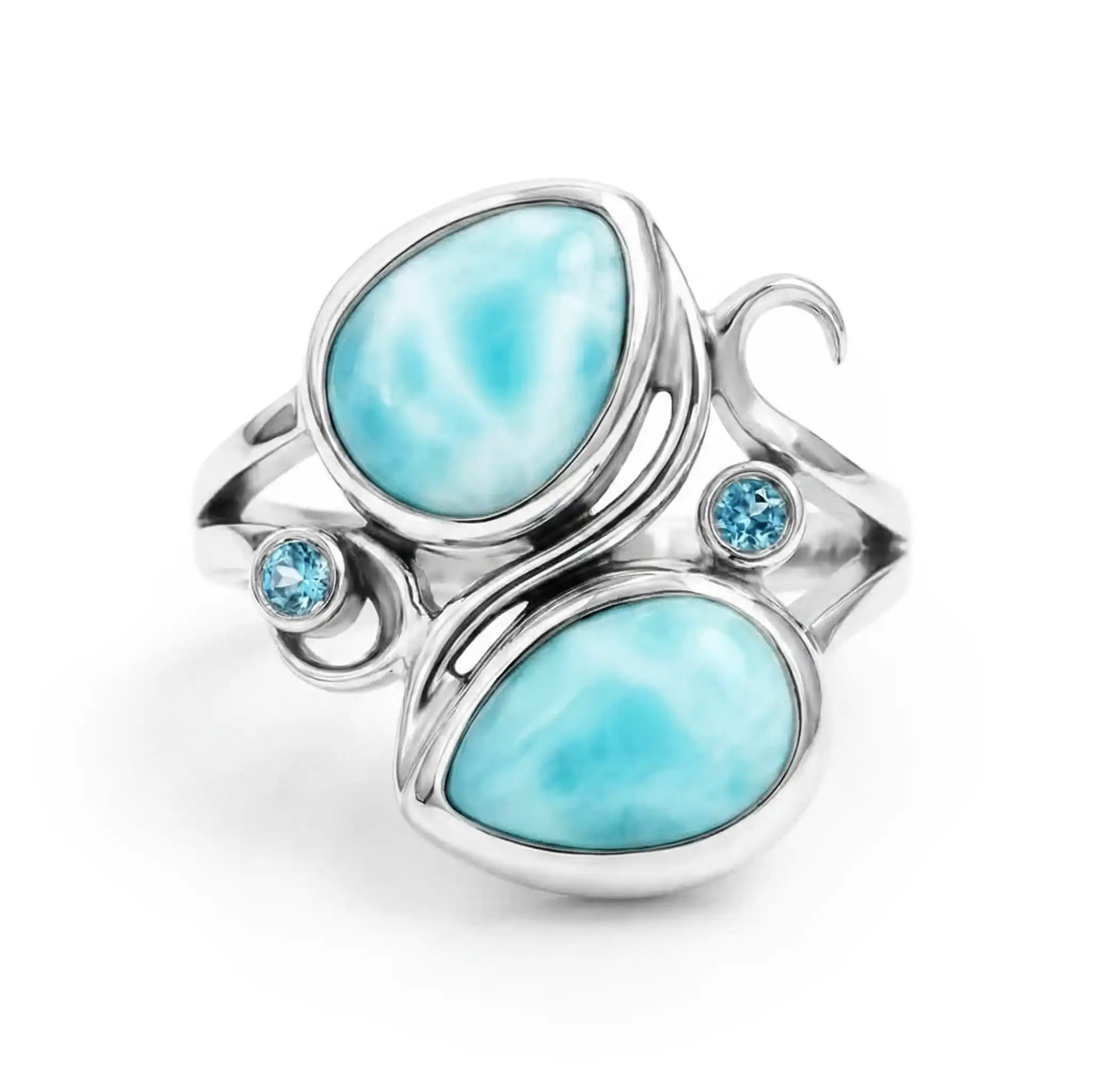 This ring is stunningly designed with two lovely teardrop-shaped Larimar stones (5/16" x 7/16" each) at its heart, radiating that unique, tranquil blue. They are beautifully accented by vibrant blue spinel and surrounded by polished sterling silver, creating a gorgeous composition that flows across your finger.