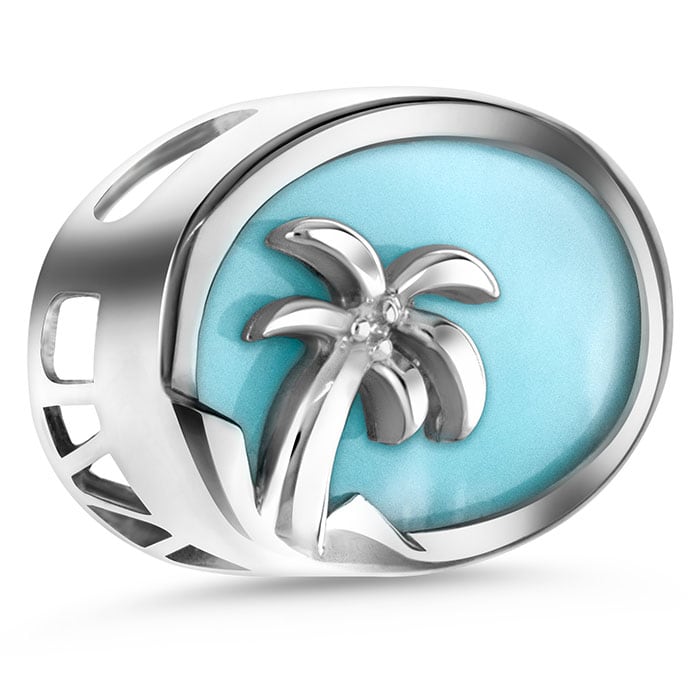 A Slice of Paradise Simple, elegant, and timeless. The Classic Palm Tree Necklace is designed for those who want to keep the spirit of the tropics close to their heart every day. A high-polished sterling silver palm tree rests gently against a backdrop of genuine Larimar, framed by sleek silver. It captures the essence of a Caribbean window view in a design that is understated enough for the office, yet striking enough for a night out.