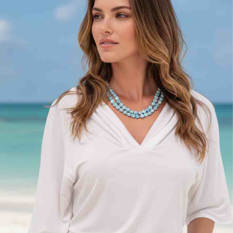 Capture the Essence of the Ocean and Immerse yourself in the rhythmic beauty of the Caribbean with the Seafoam Necklace—a breathtaking statement piece that embodies the ebb and flow of the tides. Created to remind you of the varied colors of seafoam waves washing over the shore.