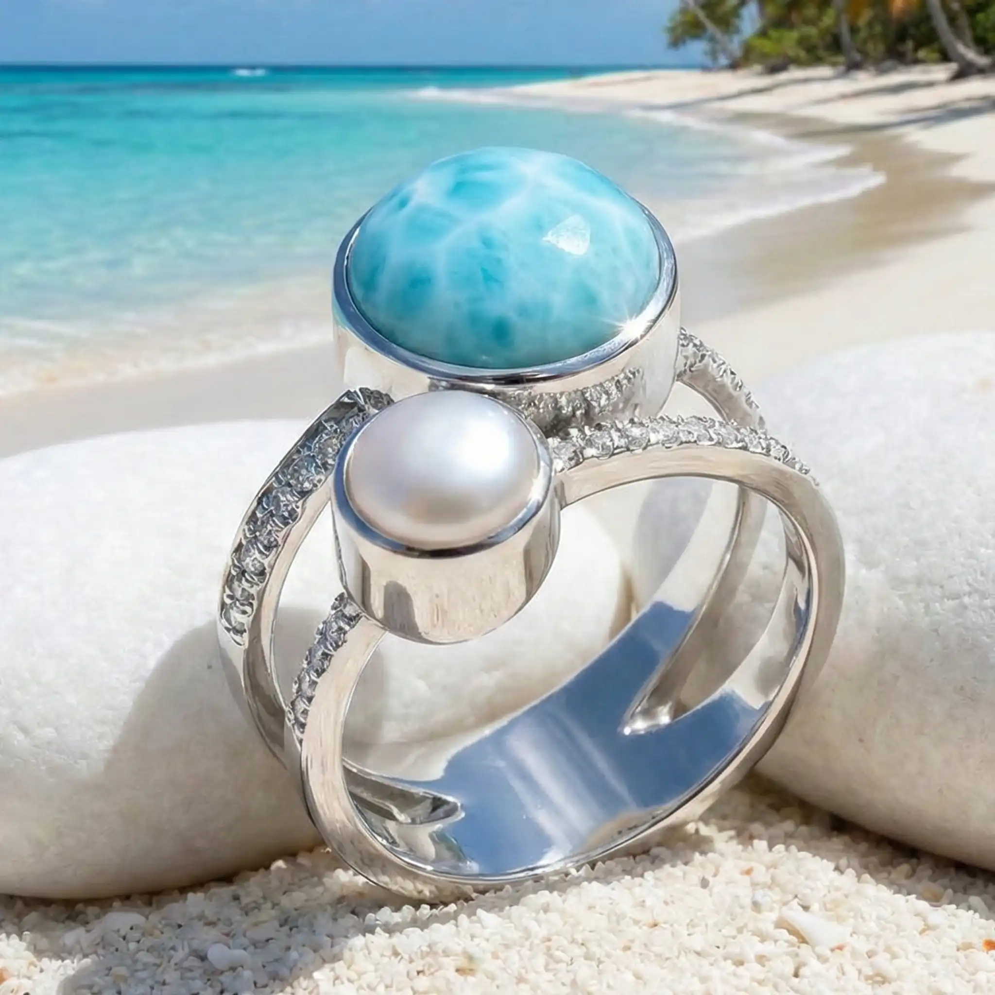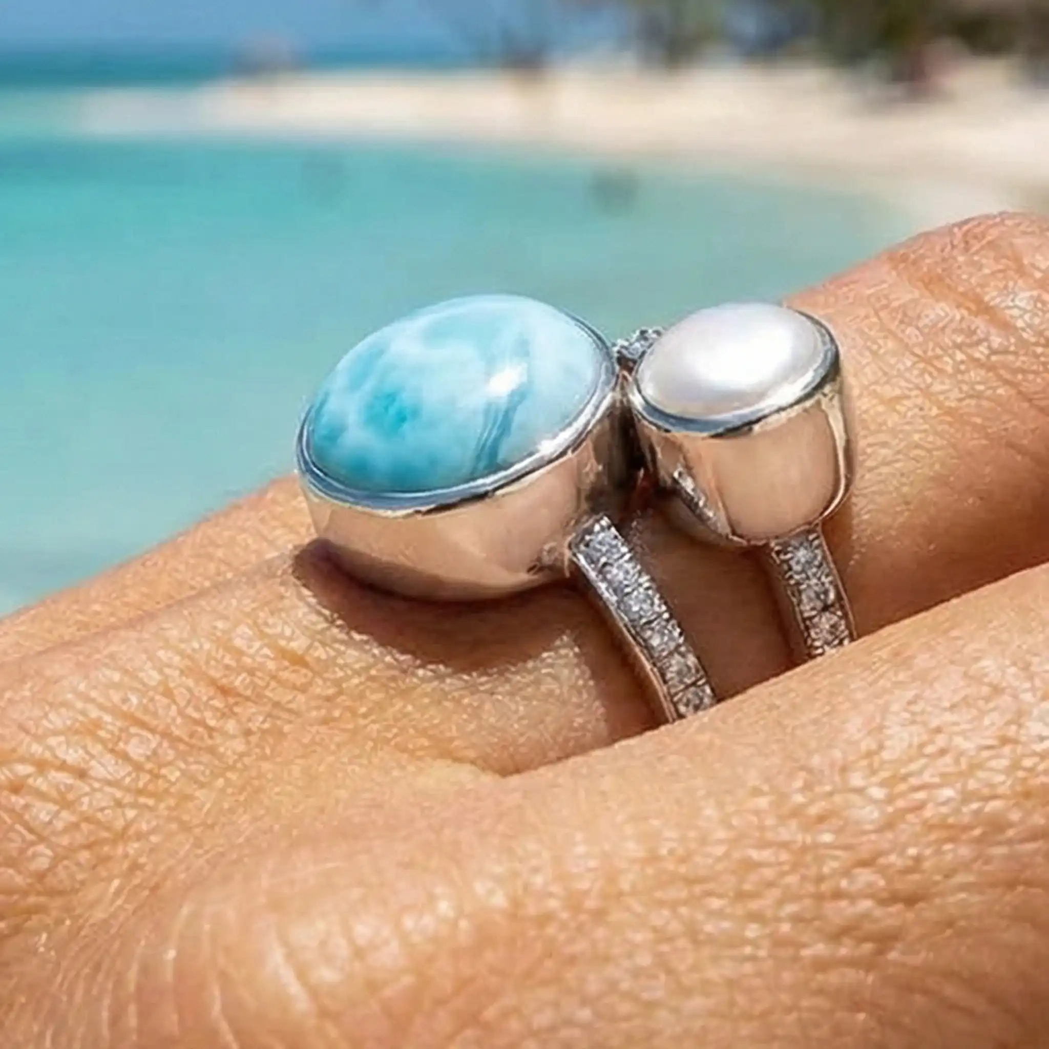 Customers say the SERENADE RING impresses with its stunning blend of pearl and Larimar, offering a refined and elegant look. Its intricate yet modern design makes it a versatile and beautiful piece for any occasion.